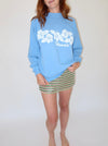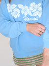 SOFT & PLUSH, FADED SKY BLUE SWEATSHIRT WITH HIBISCUS FLOWER ARTWORK.