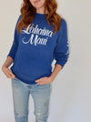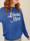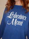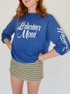 THIN & SOFT, FADED MARINE BLUE SWEATSHIRT, WITH "LAHAINA MAUI" ARTWORK ACROSS THE FRONT AND DOWN THE SLEEVE.